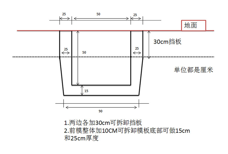 這個圖紙和客戶的標準不同,是經(jīng)過協(xié)商后的結果,這樣做的好處是能夠省下一部分混凝土,而水渠邊溝的內部大小并沒有改變。而且經(jīng)過加長擋板的設計以后,機器可以在沒有土模的支持下,懸空打水渠。
